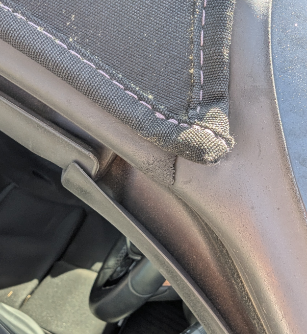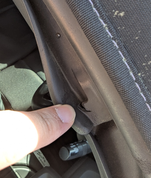 S660トラブル S660のウェザーストリップの傷み(153,000km) nanda 2026年4月12日 / 2026年4月12日 ふと見てみたら、屋根のゴム部品が傷んでいました。一部裂けています。放置するとそのうち浸水するかも…。結構費用がかかるようなので悩みます。